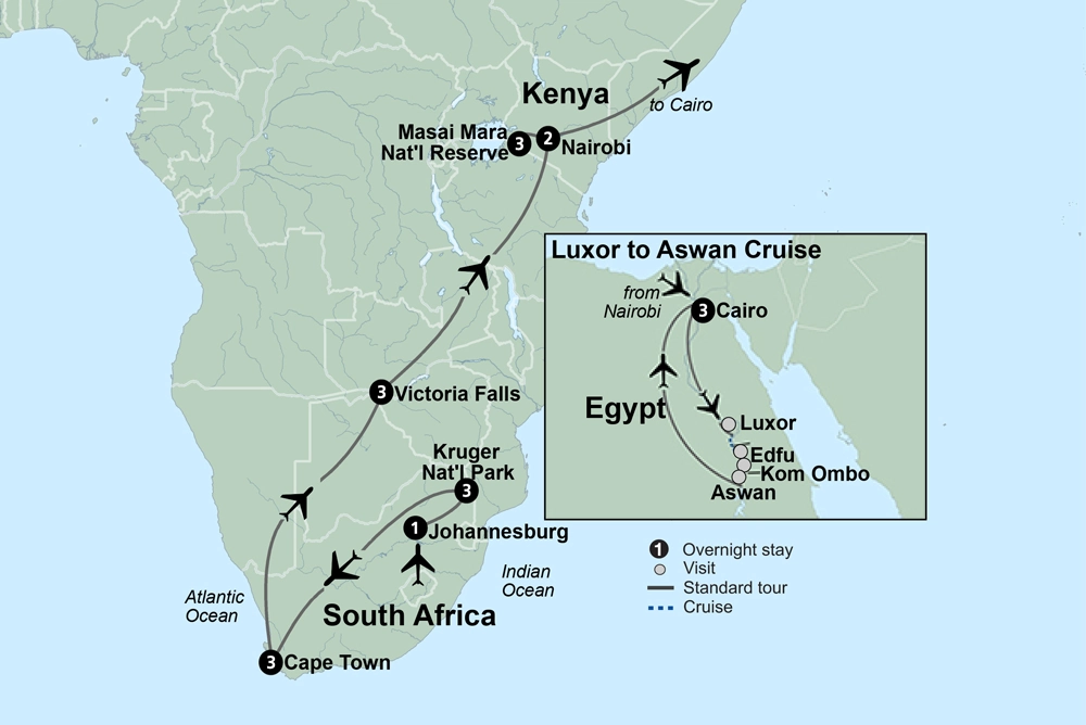 Your adventure through Africa begins! Incredible landscapes lead the way to a blend of cultural diversity, an abundance of wildlife, and remarkable history. From urban centers to untamed wilderness, this transcontinental African journey invites you to discover its soul-stirring spirit and awe-inspiring wonders.